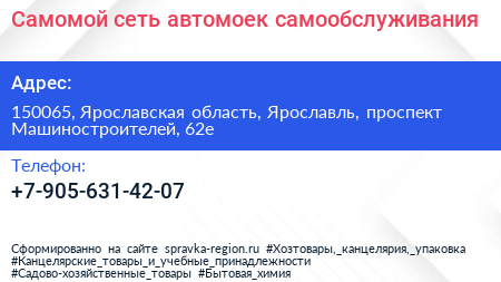 Самомой, сеть автомоек самообслуживания по адресу 150065, Ярославская область, Ярославль, проспект Машиностроителей, 62е в дальнейшем Организация, размещена в следующих категориях:
