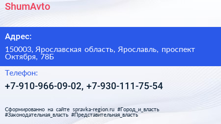 ShumAvto по адресу 150003, Ярославская область, Ярославль, проспект Октября, 78Б в дальнейшем Организация, размещена в следующих категориях: