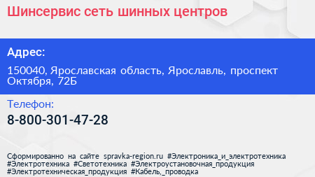 Шинсервис, сеть шинных центров по адресу 150040, Ярославская область, Ярославль, проспект Октября, 72Б в дальнейшем Организация, размещена в следующих категориях: