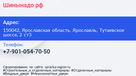 Шинынадо.рф по адресу 150042, Ярославская область, Ярославль, Тутаевское шоссе, 2 ст3 в дальнейшем Организация, размещена в следующих категориях: