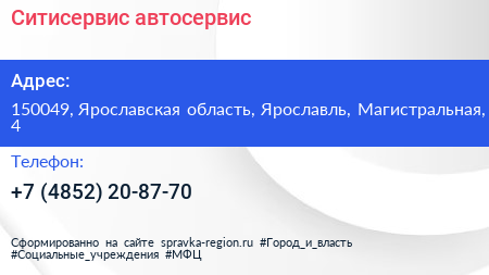 Ситисервис, автосервис по адресу 150049, Ярославская область, Ярославль, Магистральная, 4 в дальнейшем Организация, размещена в следующих категориях: