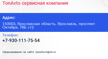 TonAvto, сервисная компания по адресу 150003, Ярославская область, Ярославль, проспект Октября, 78Б ст2 в дальнейшем Организация, размещена в следующих категориях: