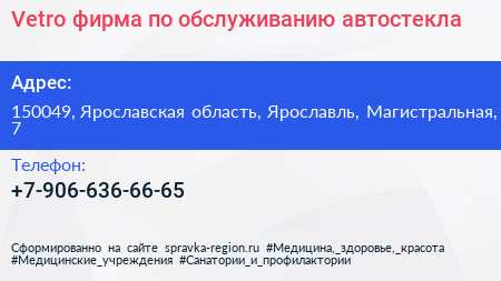 Vetro, фирма по обслуживанию автостекла по адресу 150049, Ярославская область, Ярославль, Магистральная, 7 в дальнейшем Организация, размещена в следующих категориях: