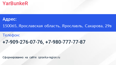YarBunkeR по адресу 150065, Ярославская область, Ярославль, Сахарова, 29в в дальнейшем Организация, размещена в следующих категориях: