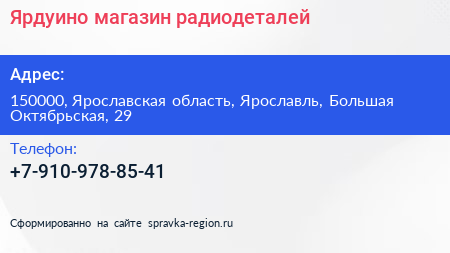 Ярдуино, магазин радиодеталей по адресу 150000, Ярославская область, Ярославль, Большая Октябрьская, 29 в дальнейшем Организация, размещена в следующих категориях: