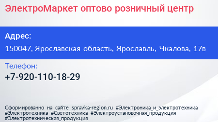ЭлектроМаркет, оптово-розничный центр по адресу 150047, Ярославская область, Ярославль, Чкалова, 17в в дальнейшем Организация, размещена в следующих категориях: