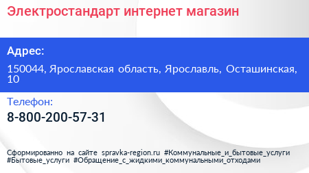 Электростандарт, интернет-магазин по адресу 150044, Ярославская область, Ярославль, Осташинская, 10 в дальнейшем Организация, размещена в следующих категориях: