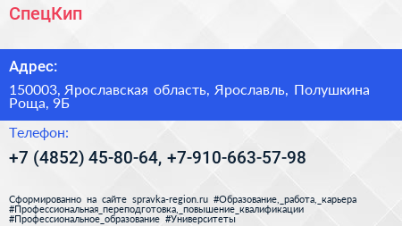 СпецКип по адресу 150003, Ярославская область, Ярославль, Полушкина Роща, 9Б в дальнейшем Организация, размещена в следующих категориях: