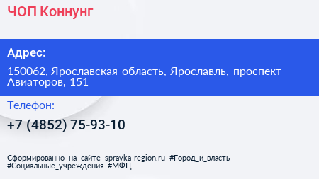ЧОП Коннунг по адресу 150062, Ярославская область, Ярославль, проспект Авиаторов, 151 в дальнейшем Организация, размещена в следующих категориях: