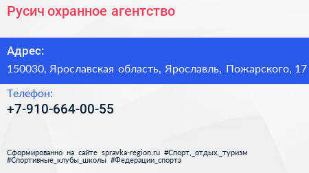 Русич, охранное агентство по адресу 150030, Ярославская область, Ярославль, Пожарского, 17 в дальнейшем Организация, размещена в следующих категориях: