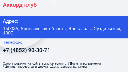 Аккорд, клуб по адресу 150035, Ярославская область, Ярославль, Суздальская, 180Б в дальнейшем Организация, размещена в следующих категориях: