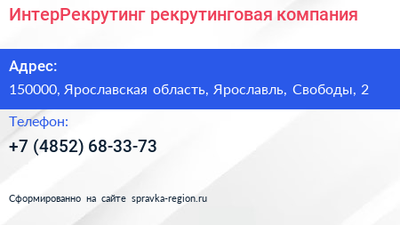 ИнтерРекрутинг, рекрутинговая компания по адресу 150000, Ярославская область, Ярославль, Свободы, 2 в дальнейшем Организация, размещена в следующих категориях: