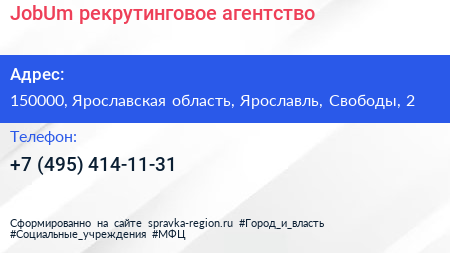 JobUm, рекрутинговое агентство по адресу 150000, Ярославская область, Ярославль, Свободы, 2 в дальнейшем Организация, размещена в следующих категориях: