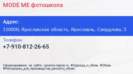 MODE ME, фотошкола по адресу 150000, Ярославская область, Ярославль, Свердлова, 3 в дальнейшем Организация, размещена в следующих категориях: