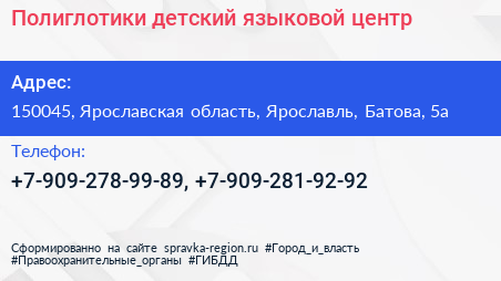 Полиглотики, детский языковой центр по адресу 150045, Ярославская область, Ярославль, Батова, 5а в дальнейшем Организация, размещена в следующих категориях:
