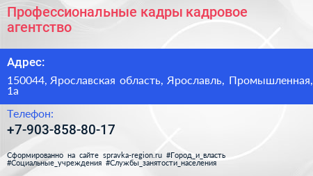 Профессиональные кадры, кадровое агентство по адресу 150044, Ярославская область, Ярославль, Промышленная, 1а в дальнейшем Организация, размещена в следующих категориях: