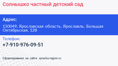 Солнышко, частный детский сад по адресу 150049, Ярославская область, Ярославль, Большая Октябрьская, 128 в дальнейшем Организация, размещена в следующих категориях: