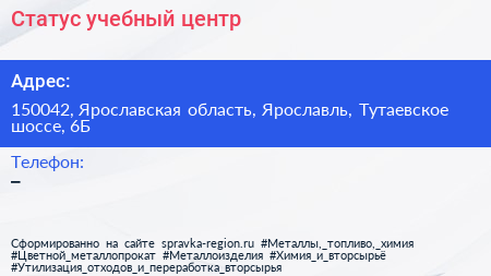 Статус, учебный центр по адресу 150042, Ярославская область, Ярославль, Тутаевское шоссе, 6Б в дальнейшем Организация, размещена в следующих категориях: