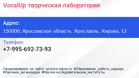VocalUp, творческая лаборатория по адресу 150000, Ярославская область, Ярославль, Кирова, 13 в дальнейшем Организация, размещена в следующих категориях: