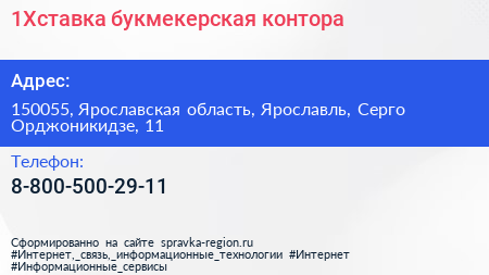 1Xставка, букмекерская контора по адресу 150055, Ярославская область, Ярославль, Серго Орджоникидзе, 11 в дальнейшем Организация, размещена в следующих категориях: