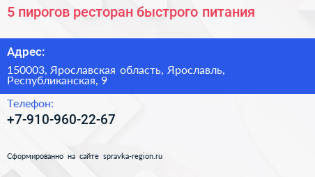 5 пирогов, ресторан быстрого питания по адресу 150003, Ярославская область, Ярославль, Республиканская, 9 в дальнейшем Организация, размещена в следующих категориях: