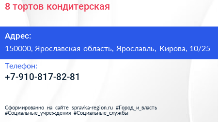 8 тортов, кондитерская по адресу 150000, Ярославская область, Ярославль, Кирова, 10/25 в дальнейшем Организация, размещена в следующих категориях: