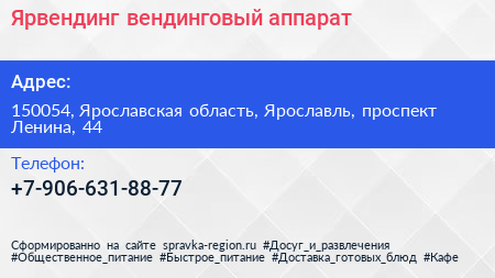 Ярвендинг, вендинговый аппарат по адресу 150054, Ярославская область, Ярославль, проспект Ленина, 44 в дальнейшем Организация, размещена в следующих категориях: