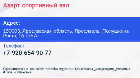 Азарт, спортивный зал по адресу 150003, Ярославская область, Ярославль, Полушкина Роща, 16 ст67а в дальнейшем Организация, размещена в следующих категориях: