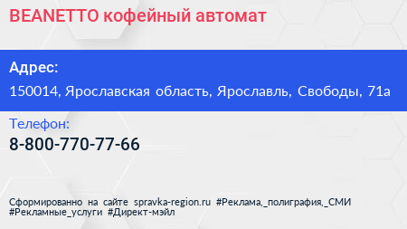 BEANETTO, кофейный автомат по адресу 150014, Ярославская область, Ярославль, Свободы, 71а в дальнейшем Организация, размещена в следующих категориях: