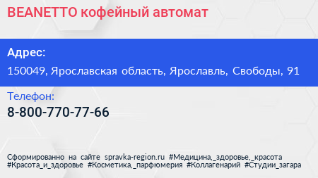 BEANETTO, кофейный автомат по адресу 150049, Ярославская область, Ярославль, Свободы, 91 в дальнейшем Организация, размещена в следующих категориях:
