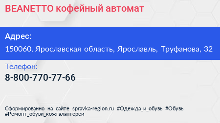 BEANETTO, кофейный автомат по адресу 150060, Ярославская область, Ярославль, Труфанова, 32 в дальнейшем Организация, размещена в следующих категориях:
