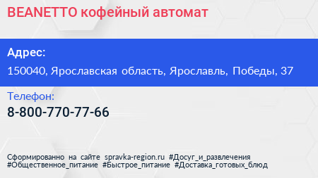 BEANETTO, кофейный автомат по адресу 150040, Ярославская область, Ярославль, Победы, 37 в дальнейшем Организация, размещена в следующих категориях: