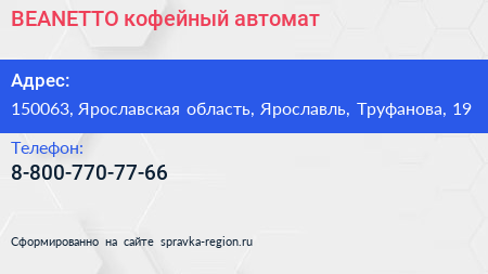 BEANETTO, кофейный автомат по адресу 150063, Ярославская область, Ярославль, Труфанова, 19 в дальнейшем Организация, размещена в следующих категориях: