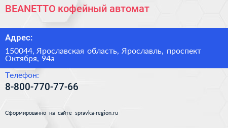 BEANETTO, кофейный автомат по адресу 150044, Ярославская область, Ярославль, проспект Октября, 94а в дальнейшем Организация, размещена в следующих категориях: