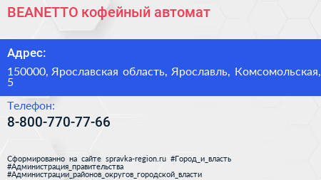 BEANETTO, кофейный автомат по адресу 150000, Ярославская область, Ярославль, Комсомольская, 5 в дальнейшем Организация, размещена в следующих категориях: