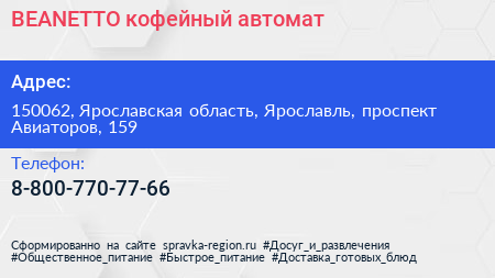 BEANETTO, кофейный автомат по адресу 150062, Ярославская область, Ярославль, проспект Авиаторов, 159 в дальнейшем Организация, размещена в следующих категориях: