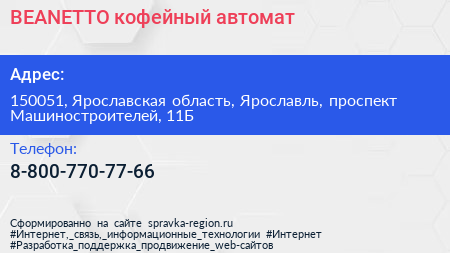 BEANETTO, кофейный автомат по адресу 150051, Ярославская область, Ярославль, проспект Машиностроителей, 11Б в дальнейшем Организация, размещена в следующих категориях: