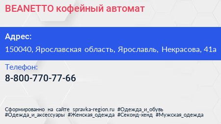 BEANETTO, кофейный автомат по адресу 150040, Ярославская область, Ярославль, Некрасова, 41а в дальнейшем Организация, размещена в следующих категориях: