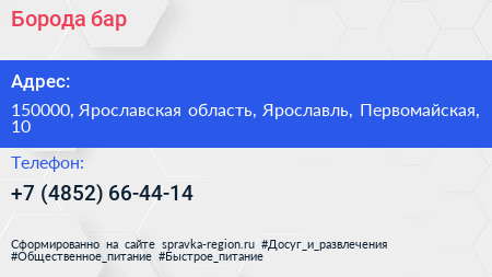 Борода, бар по адресу 150000, Ярославская область, Ярославль, Первомайская, 10 в дальнейшем Организация, размещена в следующих категориях: