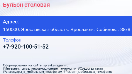 Бульон, столовая по адресу 150000, Ярославская область, Ярославль, Собинова, 38/8 в дальнейшем Организация, размещена в следующих категориях: