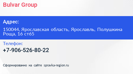 Bulvar Group по адресу 150044, Ярославская область, Ярославль, Полушкина Роща, 16 ст65 в дальнейшем Организация, размещена в следующих категориях: