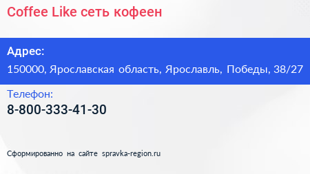 Coffee Like, сеть кофеен по адресу 150000, Ярославская область, Ярославль, Победы, 38/27 в дальнейшем Организация, размещена в следующих категориях: