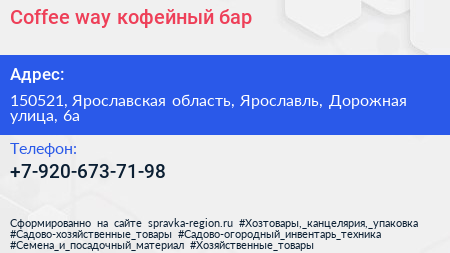 Coffee way, кофейный бар по адресу 150521, Ярославская область, Ярославль, Дорожная улица, 6а в дальнейшем Организация, размещена в следующих категориях:
