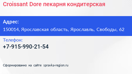 Croissant Dore, пекарня кондитерская по адресу 150014, Ярославская область, Ярославль, Свободы, 62 в дальнейшем Организация, размещена в следующих категориях: