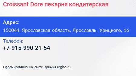 Croissant Dore, пекарня кондитерская по адресу 150044, Ярославская область, Ярославль, Урицкого, 16 в дальнейшем Организация, размещена в следующих категориях:
