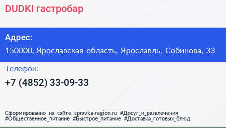 DUDKI, гастробар по адресу 150000, Ярославская область, Ярославль, Собинова, 33 в дальнейшем Организация, размещена в следующих категориях: