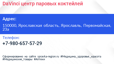 DaVinci, центр паровых коктейлей по адресу 150000, Ярославская область, Ярославль, Первомайская, 23а в дальнейшем Организация, размещена в следующих категориях:
