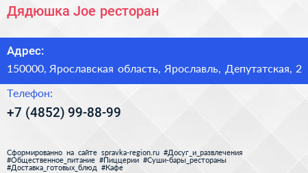 Дядюшка Joe, ресторан по адресу 150000, Ярославская область, Ярославль, Депутатская, 2 в дальнейшем Организация, размещена в следующих категориях: