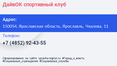 ДайвОК, спортивный клуб по адресу 150054, Ярославская область, Ярославль, Чкалова, 11 в дальнейшем Организация, размещена в следующих категориях: