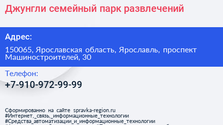 Джунгли, семейный парк развлечений по адресу 150065, Ярославская область, Ярославль, проспект Машиностроителей, 30 в дальнейшем Организация, размещена в следующих категориях: